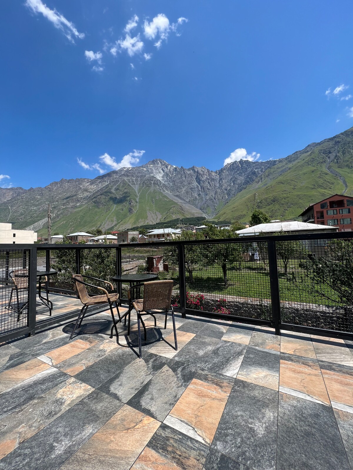 Envisagez-vous de vous débarrasser du bruit de la ville et de vous reposer dans les montagnes? Préférez-vous rester dans le confort et avoir une vue imprenable directement de votre propre chambre et balcon privé? Notre maison d'hôtes "Belmonte Kazbegi" est un choix parfait pour vous. Notre place combine sept chambres avec salles de bains privées avec une immense terrasse devant la maison, d'où vous pouvez voir une vue incroyablement belle sur l'église de la trinité Gergeti et le mont Kazbek. Nous vous offrons un séjour confortable tout en passant votre temps avec nous.