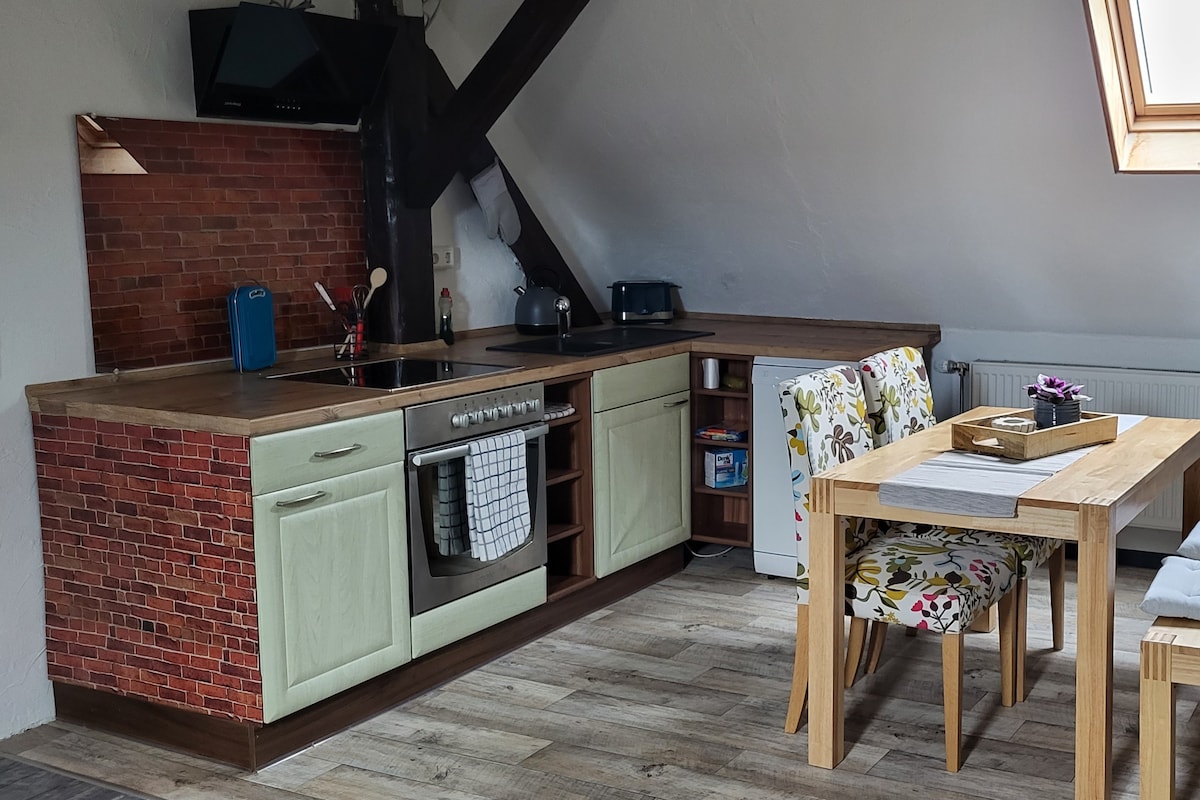 Einzigartiges Wohnen mit Flair und modernem Komfort! Neu saniertes Loft-Apartment in einer wunderschönen, alten Scheune das rustikalen Charme mit zeitgemäßem, elegantem Stil verbindet. Offenes Wohnkonzept, Wohnzimmer geht nahtlos in die offene Küche über – perfekt, um beim Kochen gesellig beisammen zu sein. Ausstattung: 1: Queensize-Bett (160 cm). 2: Doppelbett (140 cm). Hinweis: Das Apartment verfügt über mehrere Treppen und Ebenen und ist nicht für Gäste mit Kindern geeignet.