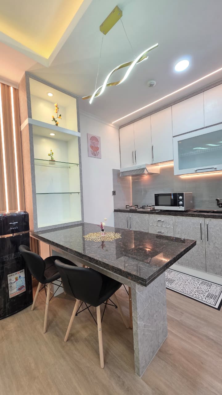 Newly renovated 2 Bedroom apartment — a comfortable, cozy, and modern design. Located in Kelapa Gading, Jakarta · 2BR unit apartment with 1 Queen Bed & 1 Double Bed · Fully equipped kitchen · Spacious living room · Cool down with AC in every room & hot water for your relaxing shower · Complimentary drinking water & essentials · Convenience Store on the Apartment premises A comfortable space for your stay!