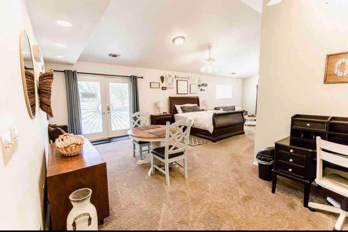 Notre immense suite de 825 pieds carrés est l'endroit idéal pour se ressourcer. Vous aurez l'impression d'être dans une retraite à la campagne, mais à seulement quelques minutes en voiture des commerces et de l'accès à l'autoroute. Détendez-vous dans la baignoire à jets ou frottez vos soucis dans une douche gigantesque. Savourez votre café du matin sur le patio en écoutant le chant des oiseaux ou en regardant les magnifiques couchers de soleil. Notre belle suite offre son propre espace de bureau, une table, un canapé (frais de conversion), un lit Queen confortable et un grand parking ! Pièce d'identité requise avant l'arrivée