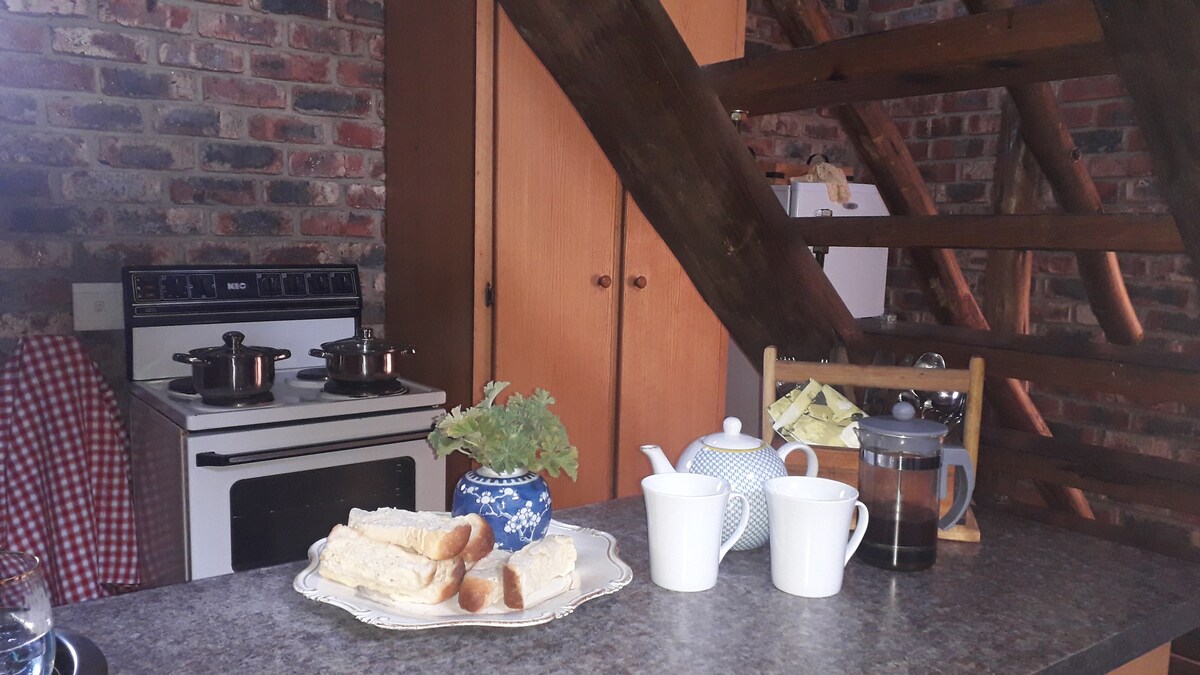 Ce logement affiche un style résolument unique. Appartement d'une chambre avec salle de bains privative, joint à une maison principale avec des installations indépendantes. Le séjour est chauffé par une cheminée à bois et la chambre avec salle de bains privative dispose d'un climatiseur. Installations de braai sur place ainsi qu'une télévision connectée avec DSTV et une connexion Wi-Fi. À deux ou trois kilomètres du centre-ville, sur un flanc de montagne. Il s'agit du niveau inférieur d'une maison de trois étages, mais complètement privé et non affecté par le délestage des charges.