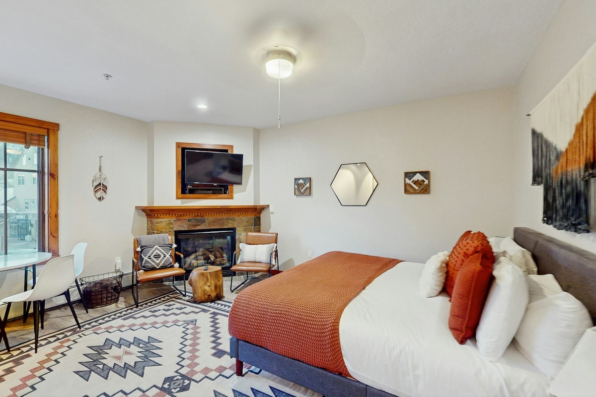 Comfortable pet friendly studio in Keystone. Studio has a gas fireplace, WiFi, TV w/ cable & streaming, free heated garage parking, elevator, & free shuttle to the slopes. Located steps to hiking trails, bike path, & the Snake River. Located on Keystone Lake w/ ice skating in the Winter, & water activities in the Summer. Enjoy the amenities which include 2 hot tubs, large heated indoor/outdoor pool, steam room, sauna, spa w/ services, & fitness area. Awesome location for any season!