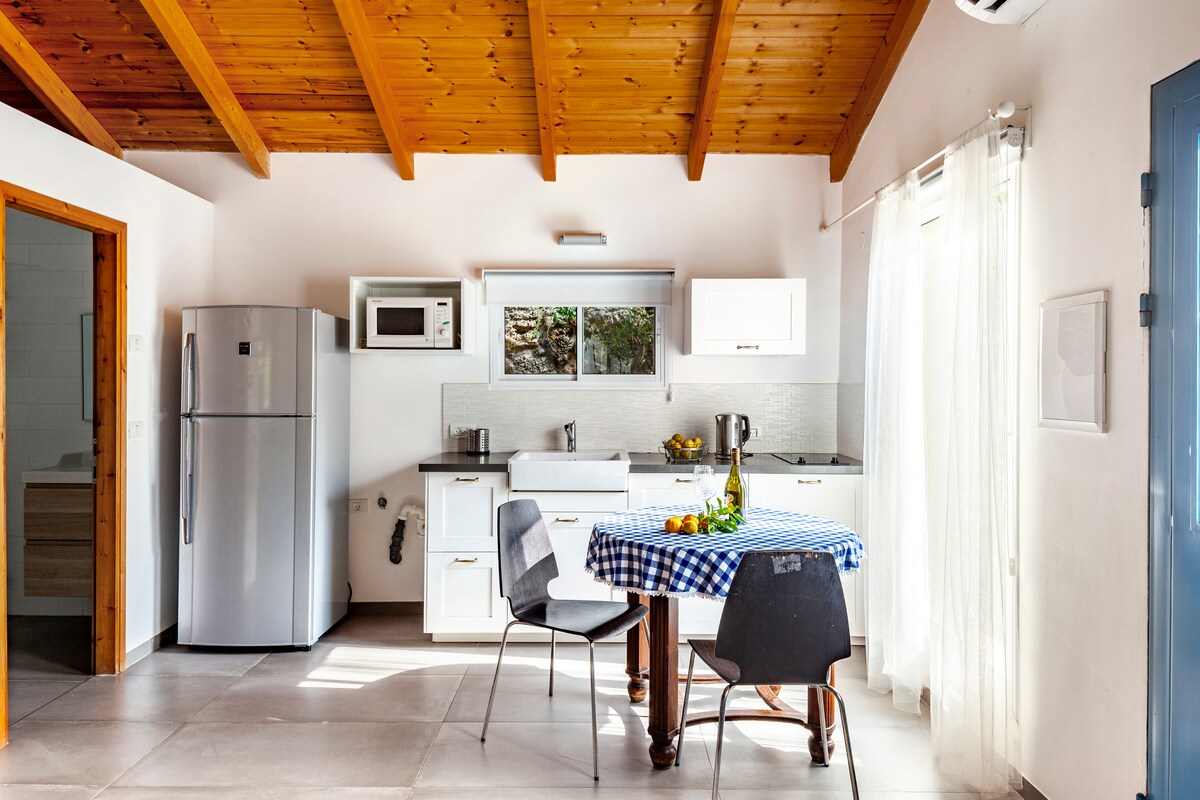 Bienvenue dans l'appartement avec vue sur le verger à Tel Mond – un endroit chaleureux et accueillant, parfait pour les couples et les familles. L'appartement est situé au deuxième étage au-dessus de la maison d'hôtes et est accessible par des escaliers. Il se compose de 2 chambres, d'une salle de bains, d'un salon avec un canapé confortable et d'une télévision connectée, et d'une cuisine entièrement équipée avec tous les équipements nécessaires pour un séjour agréable. Sur le toit privé, vous pouvez profiter d'un coin repas pour 6 personnes, d'une cuisine extérieure et d'un espace barbecue – idéal pour les repas avec vue. Il y a un abri public à seulement 100 m. L'appartement peut accueillir jusqu'à 5 personnes, offrant une expérience accueillante et agréable à tous les invités.