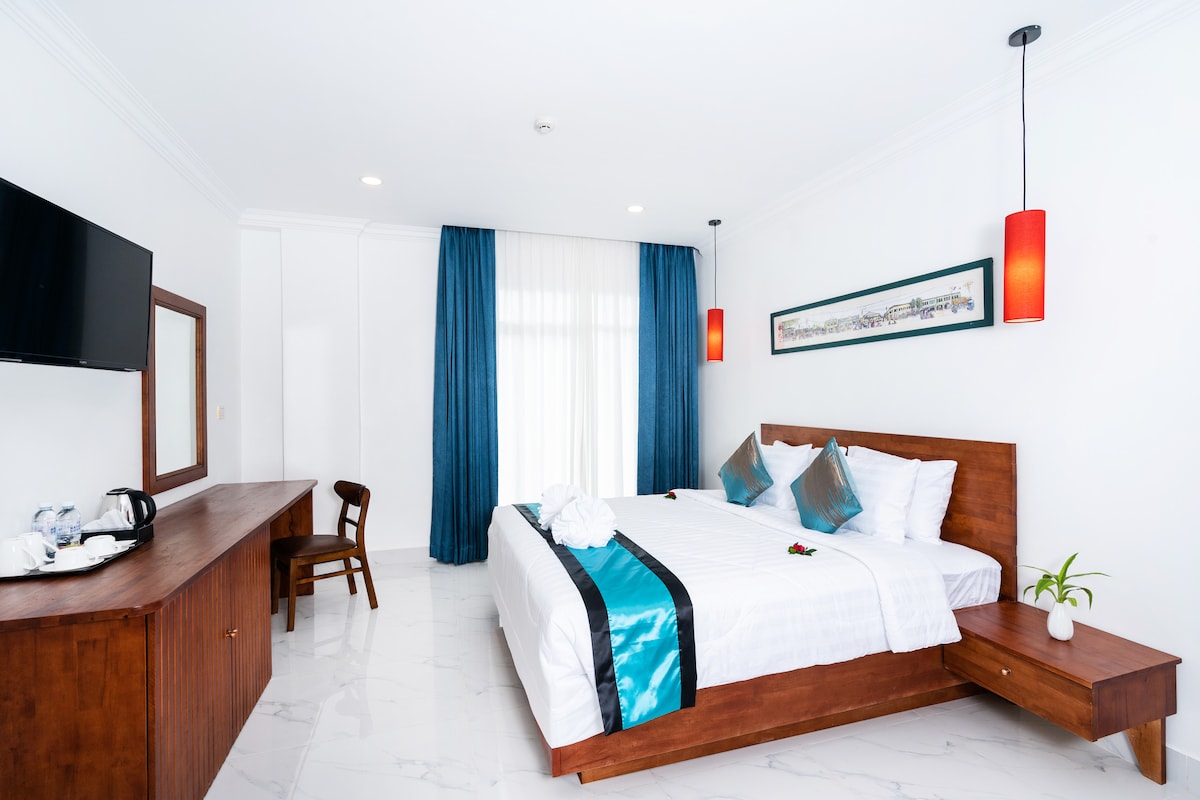 The Modern Chic Suite King at Jaya Suites Phnom Penh presents 63 sqm of tasteful interiors, private balcony, and a refined setting ideal for relaxation.