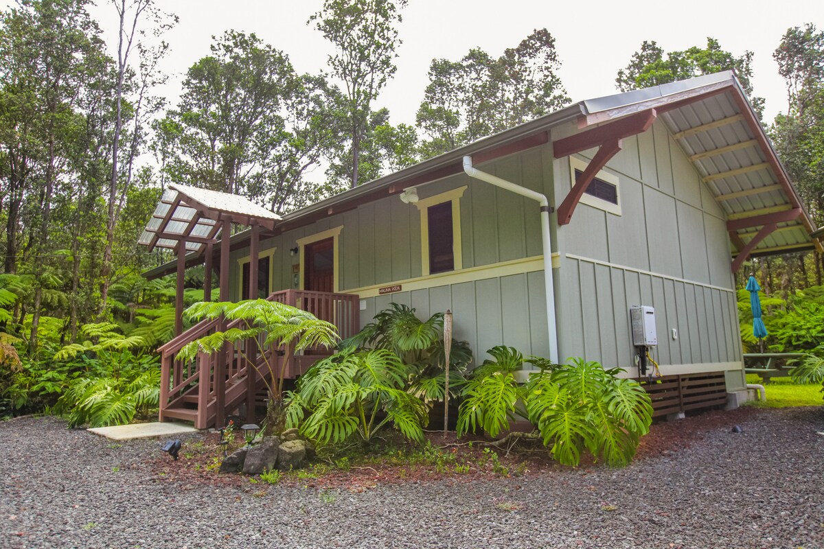 VOTRE CHALET PRIVÉ PARMI LES FOUGÈRES ARBOREES Entrez dans un sanctuaire romantique de forêt tropicale à quelques minutes du parc national des volcans d'Hawaï. Niché parmi les arbres ʻōhiʻa et hapuʻu indigènes, ce spacieux chalet d'une chambre de 850 pieds carrés est parfait pour les amoureux de la nature, les couples et les voyageurs en solo à la recherche de paix et d'inspiration.