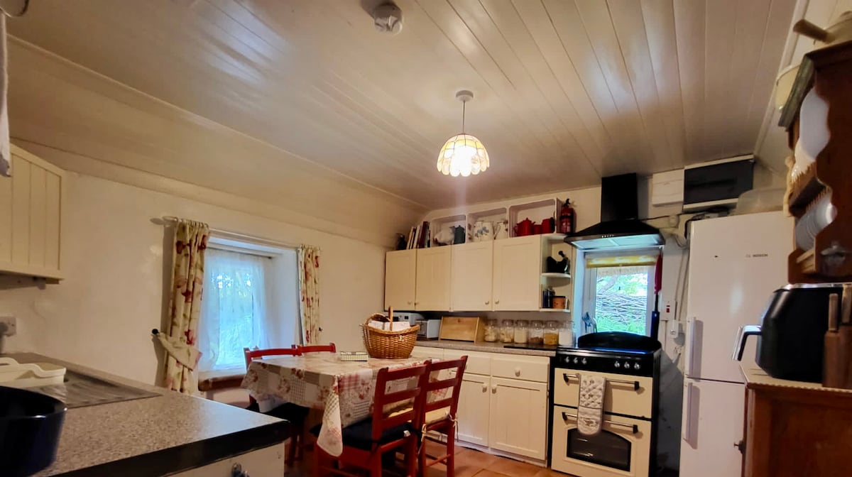 Une belle grange traditionnelle en pierre transformée en un espace de vie contemporain/industriel/rustique avec des touches originales. Situé dans les contreforts idylliques des montagnes de Wicklow, sur la Wicklow Way, il dispose d'une cuisine/salon/salle à manger ouverte, d'une chambre en mezzanine et d'une salle d'eau spacieuse. Une extension offre un débarras supplémentaire/salle de bain rustique/toilettes et une cour pavée. Le terrain est composé de pelouses supérieures et inférieures situées sur un demi-hectare. Un pub de campagne est accessible à pied.
