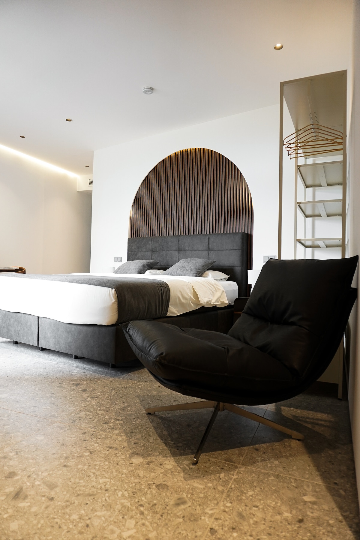 Chambre double de 21 m² au design moderne, mobilier confortable et salle de bain lumineuse et contemporaine. La nuitée comprend le petit-déjeuner, l'utilisation gratuite de l'espace sport et spa avec sauna, bain turc, cabine infrarouge, salle de fitness et de relaxation, ainsi que le Wi-Fi gratuit dans tout l'hôtel.