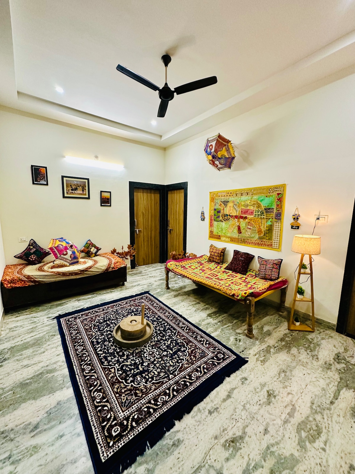 Des plats faits maison sont également disponibles sur demande 🍛, afin que vous puissiez profiter de saveurs locales authentiques pendant votre séjour ! 🌅 Bienvenue dans notre belle maison traditionnelle 2BHK au cœur de Jaisalmer, à seulement 10 minutes à pied de Patwa Haveli 🕌 et à 1 km du célèbre lac Gadisar 🌅. Entrez dans un espace qui allie tradition du Rajasthan et confort moderne. Profitez du salon spacieux avec une Smart TV de 80 pouces 📺, où vous pourrez vous détendre et regarder vos émissions préférées sur Netflix 🍿 après une longue journée d'exploration.