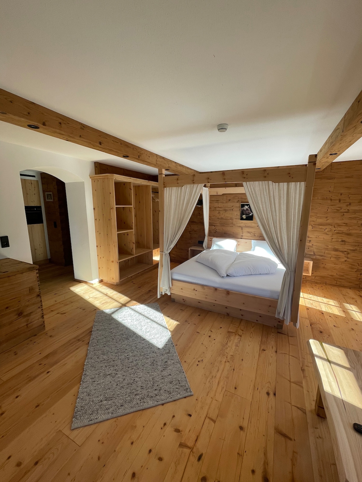 L'appartement panoramique est aménagé en bois ancien. Il dispose de deux chambres avec lits doubles et d'une chambre avec lits superposés, Dans le salon, vous pourrez vous détendre sur le canapé confortable ou cuisiner dans la cuisine ouverte avec un coin repas confortable. La salle de bain est équipée d'un double lavabo, d'une douche et d'une baignoire avec vue panoramique. Vous profiterez également d'une vue magnifique depuis les deux terrasses sur le toit (sud et nord) ou le balcon (est).