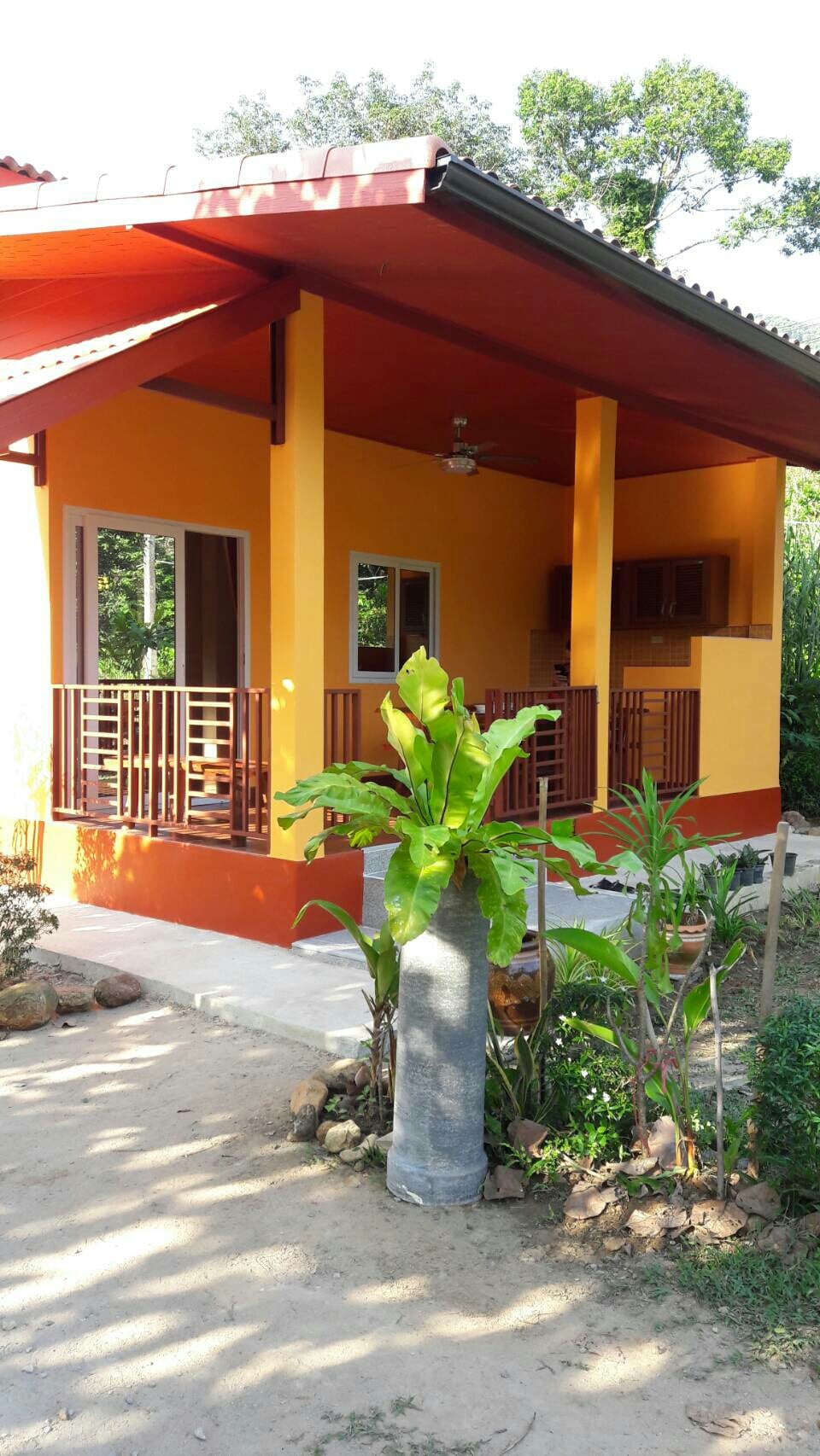 Une maison confortable entièrement meublée et bien équipée est située sur une propriété spacieuse avec un jardin tropical magnifiquement entretenu, à côté d'une rivière propre (saisonnière). Une plage de sable blanc pittoresque et des commerces pratiques sont à seulement 5-10 minutes en scooter. La vallée immaculée de Klong Son, couverte d'une forêt vierge, abrite une faune diversifiée, des cascades et un sanctuaire d'éléphants. Cet endroit tranquille et serein est idéal pour les amoureux de la nature et offre un accès facile pour explorer les deux côtés de Ko Chang