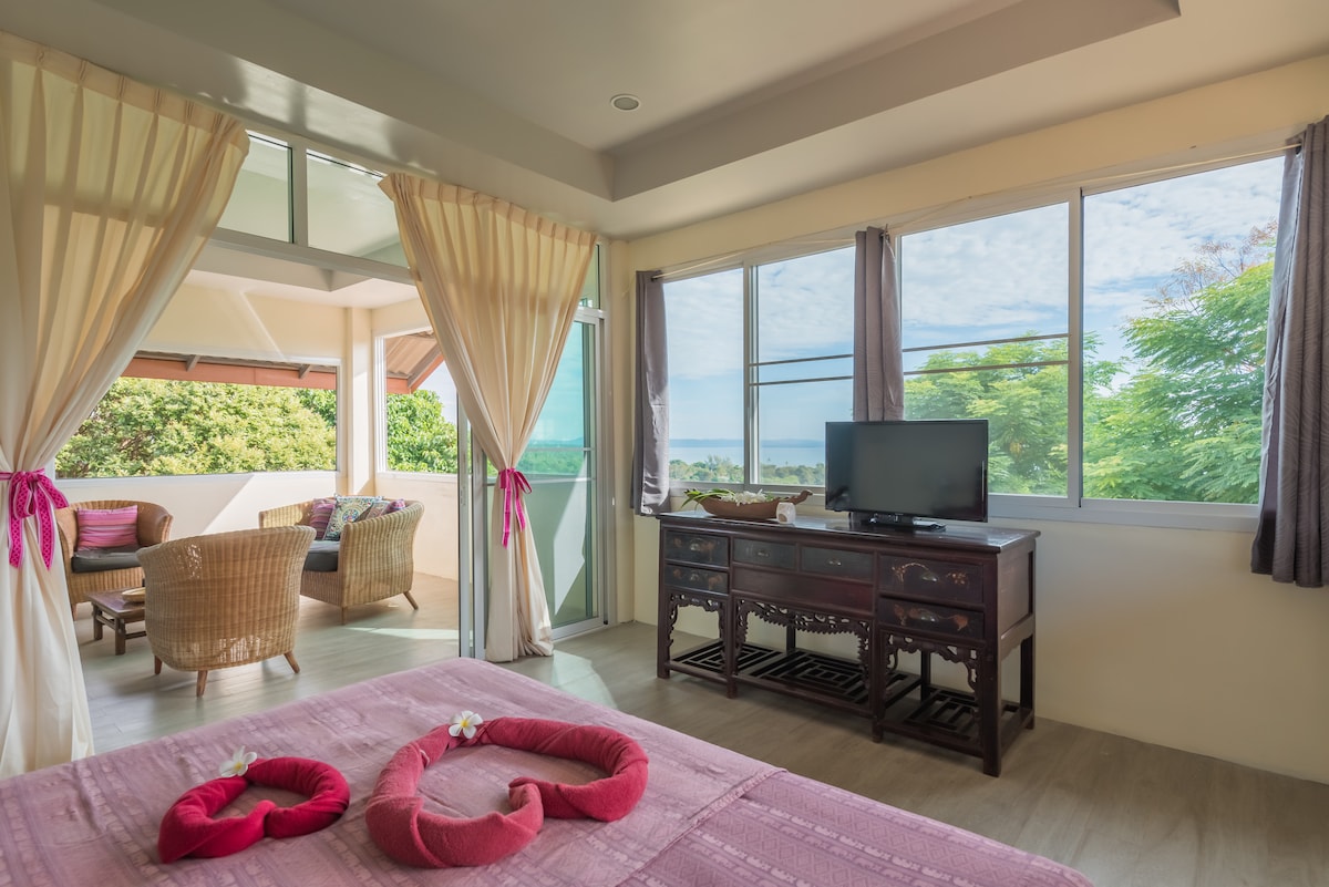 Cette spacieuse villa en bord de mer sur la magnifique Koh Mak, dans le golfe de Thaïlande, offre des couchers de soleil époustouflants et une ambiance insulaire détendue. Profitez d'une grande terrasse sur le toit, d'un balcon, d'une kitchenette extérieure de base, de la climatisation, d'une connexion Wi-Fi rapide et d'un bureau dédié, idéal pour les longs séjours. Les voyageurs ont accès à une piscine commune et à des installations sportives de premier ordre, notamment une école professionnelle de Muay Thai, du yoga (sur demande), une salle de sport en plein air, du tennis, du basket-ball et du tennis de table. Parfait pour le travail, l'entraînement et la récupération en bord de mer.