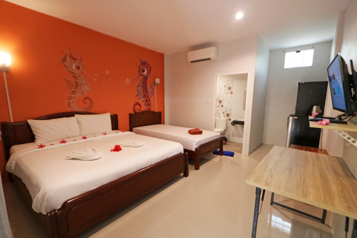 Profitez d'un séjour confortable dans notre chambre lumineuse et spacieuse, à quelques pas de la magnifique plage de Klong Dao. Parfaite pour les couples, les amis ou les petites familles, cette chambre dispose d'un lit double et d'un lit simple, ce qui la rend idéale pour accueillir jusqu'à 3 personnes. Restez près de la plage, des restaurants et des commerces locaux tout en profitant d'une atmosphère simple et relaxante chez nous. Parfait pour les clients qui aiment le confort et la commodité dans un cadre insulaire convivial.