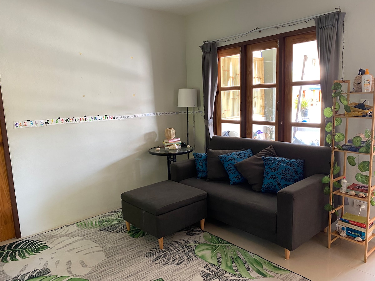 Just 50 m from the beach, this bright tropical house offers peace, comfort and perfect location in the heart of Koh Phangan. Spacious 1-bed house (65 m²) with a large wooden terrace, full kitchen, air-conditioned living room, king-size bed, fast Wi-Fi and modern bathroom. (+ one sofa-bed in the living room.) Walk to cafés, yoga studios and sunset spots at Srithanu/Hin Kong. Quiet area, no construction nearby — ideal for long stays or digital nomads.