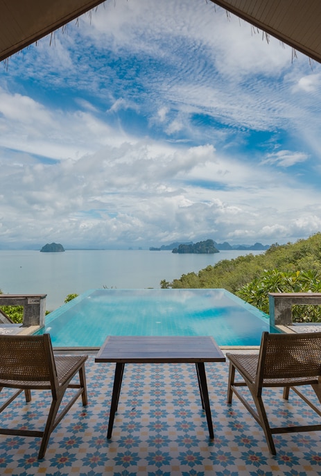 Les luxueuses terrasses traditionnelles de style thaïlandais surplombant la mer d'Andaman et la ligne d'horizon panoramique. Parfaites pour les couples ou les familles, même spacieuses, les suites créent une expérience de luxe privée avec des touches thaïlandaises, une piscine privée, un patio confortable et la baignoire extérieure submergée tandis que le choix et le plaisir sont à vous.