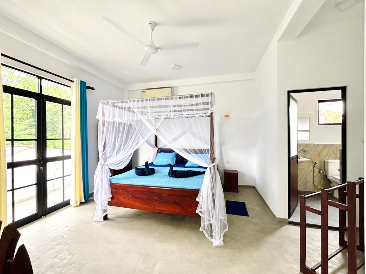 Notre chambre élégante à Ahangama offre un mélange parfait de confort moderne et de charme tropical. Avec un lit king-size confortable, une salle de bain élégante avec douche à effet pluie et une terrasse privée donnant sur le jardin et la piscine spacieuse, c'est le refuge idéal. Les matériaux naturels et un design lumineux et aéré créent une atmosphère relaxante – parfait pour profiter de la beauté du Sri Lanka.