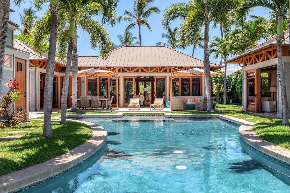 Decorated with mature palms and lush greenery, Na Hale 1 celebrates modern Hawaiian living at its finest. Enjoy beautiful sunsets over the ocean from your backyard, or from your private beach club. Na Hale 1 has a close proximity to the 5-star private Pauoa beach and club - just a few minutes walk, or 2-minute golf cart (included) ride away. Spacious great room/kitchen combination with 3 bedroom suite pods surrounding a generously sized pool and hot tub, each of which is a bedroom/bath suite.