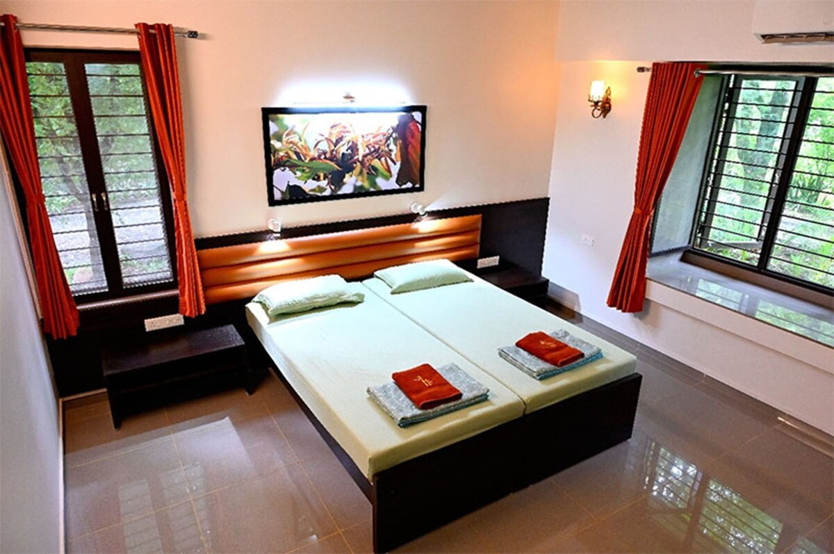 This listing is for ONE room with ONE double bed and ONE sofa cum bed. Welcome to our humble lake view farm stay with air-conditioned rooms, open to large groups, families, young adults, company retreats, get-together parties and couples. We are walking distance from Awas beach and the best part about our place is that it is surrounded by GREENS! No noise, just the chirping of the birds and the sighs of the winds. Take a dip in the lake or enjoy the scenic views, we can't wait to host YOU!