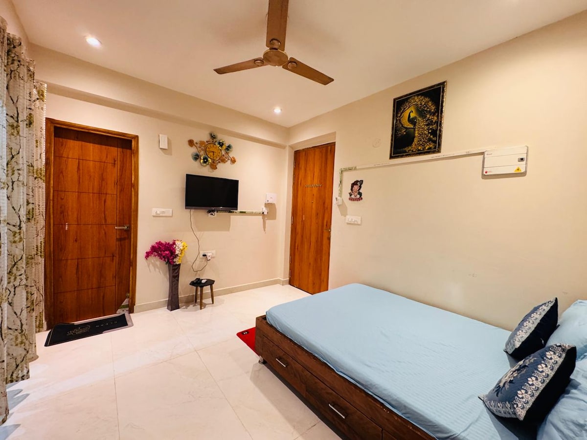 Un séjour paisible 1BHK à seulement 1 km de Prem Mandir 🌸 Profitez d'une vue sereine sur Prem Mandir et Char Dham depuis le balcon, ainsi que de l'un des plus beaux couchers de soleil de Vrindavan. La maison offre calme, confort et un espace de méditation dédié pour un séjour spirituel. Parfait pour les familles, les couples et les groupes pour se détendre et s'imprégner de l'énergie divine de Braj. 📌 Remarque : un deux-roues 🛵 est disponible à la location dans le parking de la propriété pour faciliter les déplacements locaux.