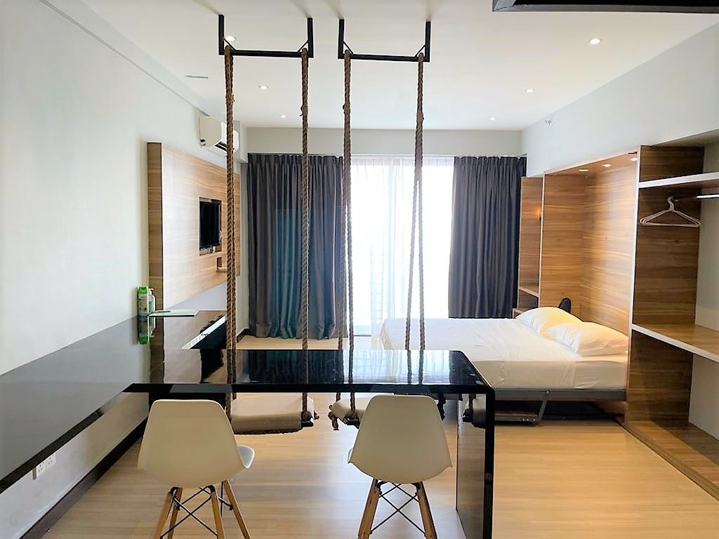 Studio (avec balcon vue sur le jardin) Situé près de l'aéroport de Kota Kinabalu à 5 minutes en voiture de la plage de Tanjung Aru 10 minutes en voiture du centre ville de KK TV avec chaînes Astro WiFi Fer et planche à repasser Bouilloire Réfrigérateur Cuisine, cuisinière, casserole, spatule, planche à découper, couteau, assiettes et couverts 1 lit King Size Armoire ouverte pour suspendre les vêtements Salle de bain : Chauffe-eau, Shampoing pour le corps et les cheveux, Rouleaux de toilette