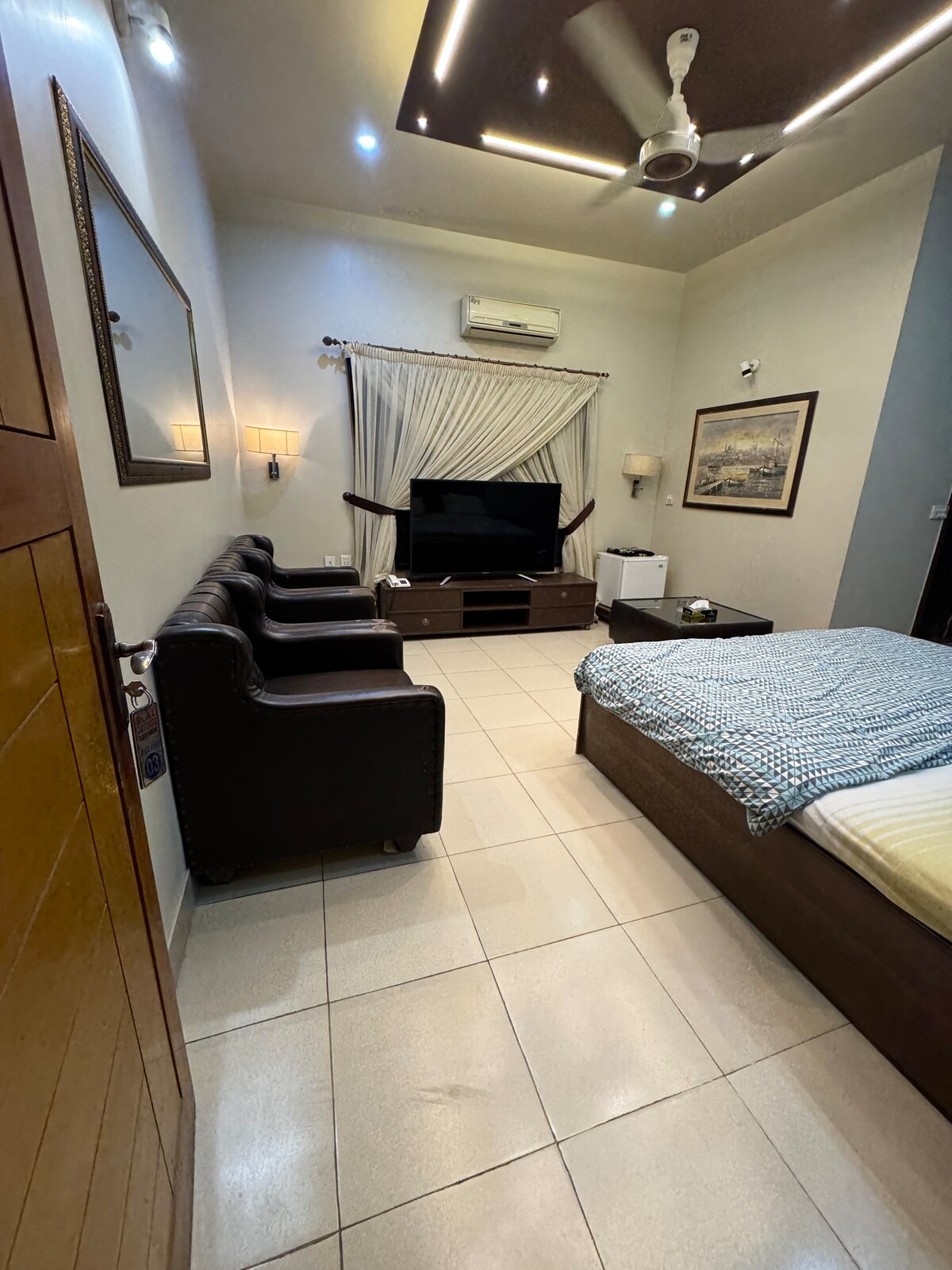 Maison privée confortable d'une chambre avec salle de bain attenante, canapés confortables et coin repas. Situé sur l'avenue Qadir, près de l'Everest Law College Bypass, à côté de Saima Downtown et à proximité du restaurant Kababjees. Comprend un parking, un environnement paisible et un accès facile aux routes principales, aux restaurants et aux besoins quotidiens : idéal pour les couples, les familles ou les voyageurs d'affaires.