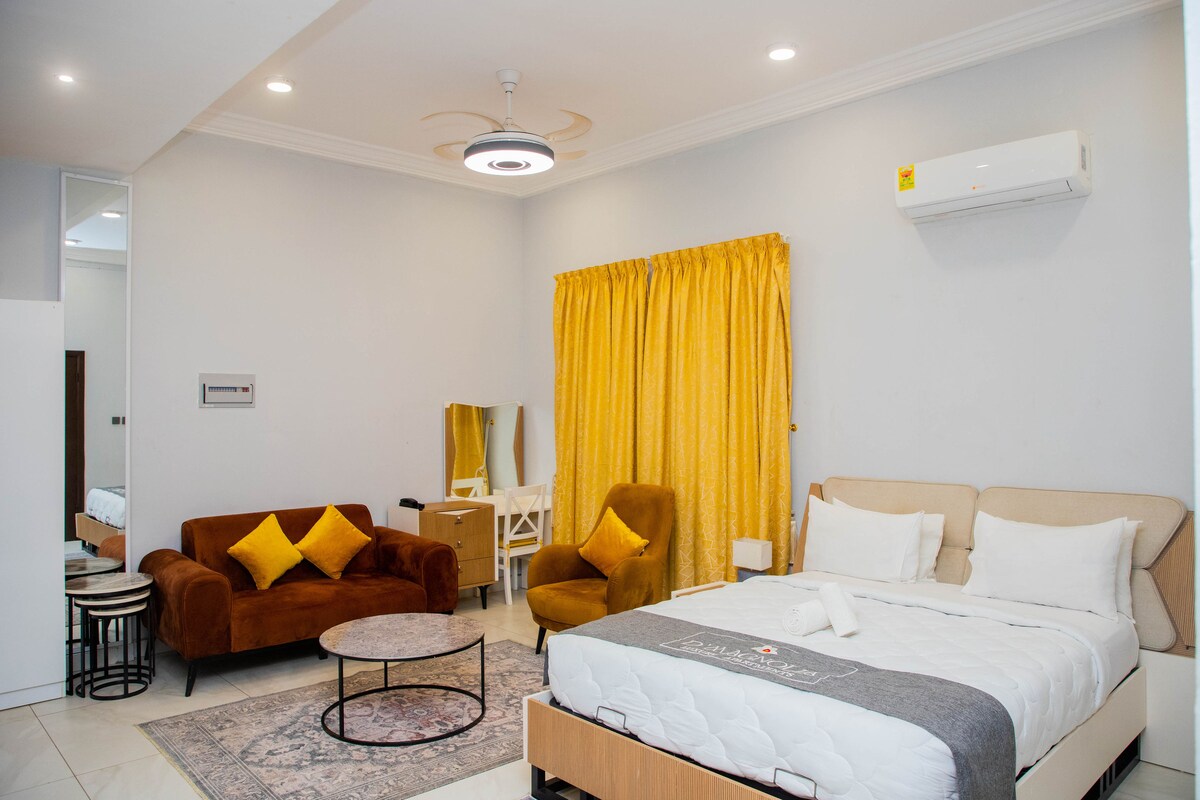 Une suite fraîche et confortable avec une kitchenette dans une communauté fermée bien planifiée avec 2000 maisons et des services de sécurité 24/ 7,une police et une caserne de pompiers,un centre récréatif.Les clients qui aiment garder la forme peuvent énumérer avec la salle de sport moderne bien équipée à l'extérieur de la porte principale du domaine.Deuxièmement, le domaine est également très sûr pour ceux qui voudraient courir ou marcher pour garder la forme.Nous avons un magasin pratique dans la maison où vous pouvez acheter vos affaires, tous ces sont conçus pour votre confort et séjour pratique.