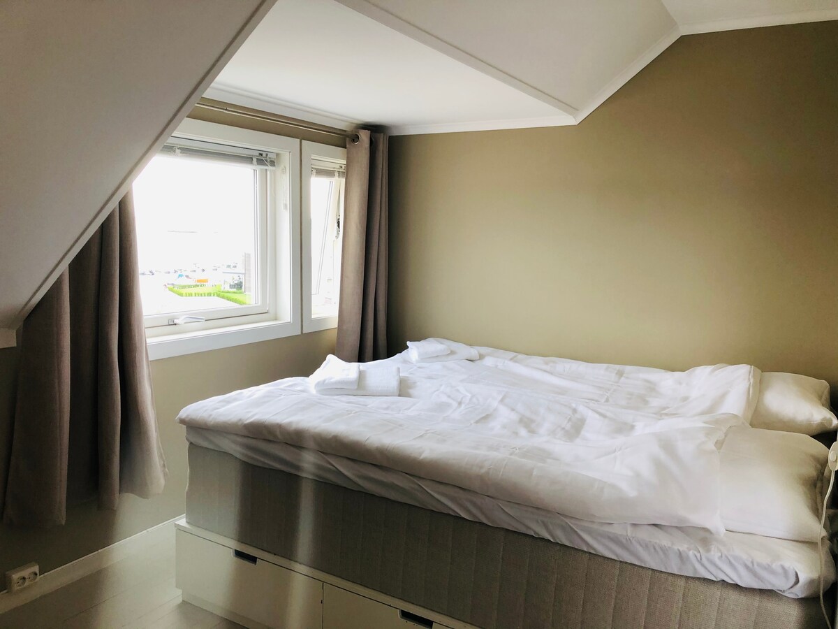 Parking gratuit à 50 m de la maison. La maison est délicatement rénovée et dispose de nombreux lits. Salon et cuisine ouverts avec table à manger et coin salon, une chambre avec lit double, salle de bain avec câbles chauffants et cabine de douche et buanderie privée. Au deuxième étage, il y a deux grandes chambres et une autre salle de bain avec câbles chauffants et cabine de douche. Depuis le salon du premier étage, vous pouvez accéder directement à une terrasse avec une grande table et de nombreuses places assises. Le linge de lit et les serviettes peuvent être loués pour 150 NOK par ensemble ou vous pouvez apporter votre propre linge.