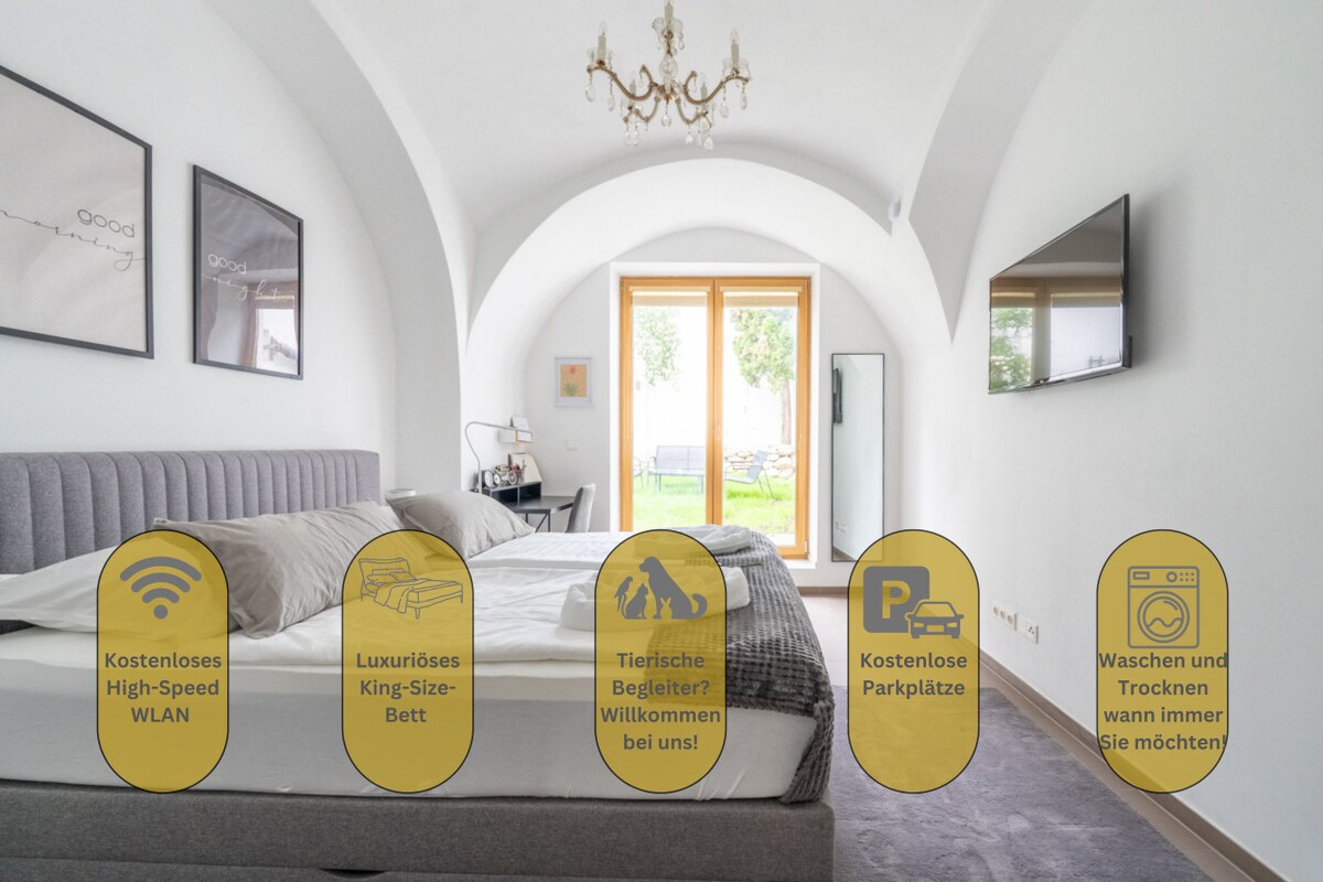 Enjoy our modern apartment, gateway to the Wachau Valley: Central location near Old Town, with supermarket next door. 80m² of bright, high-ceiling living space Free garage parking x2! Comforts like king-size adjustable bed, office/second bedroom, large bath and shower, washer/dryer Two comfy double sofa beds Fully equipped, modern kitchen, smart TV, high-speed internet, floor heating, air system Loggia with Old Town views Secure bike storage Perfect to explore local vineyards and historic sites