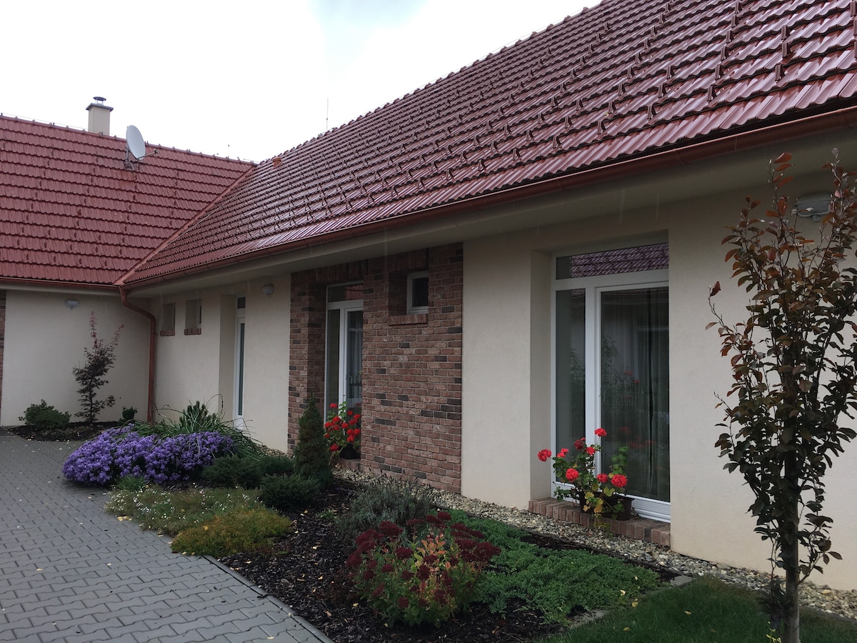 Vous découvrirez l'atmosphère unique d'une soi-disant chambre avec jardin dans une colonie de maisons en briques Bata. - Dans tous les cas, vous avez tout l'étage supérieur pour vous, y compris la salle de bain et la mini-cuisine dans le couloir. - Grands groupes : la huitième personne dormira sur un lit gonflable, tout voyageur supplémentaire sur des matelas de sol - Deux chiens sympathiques et un chat vivent au niveau inférieur. L'endroit ne convient donc pas aux personnes allergiques. - Si possible, je quitterai toute la maison selon un accord individuel.