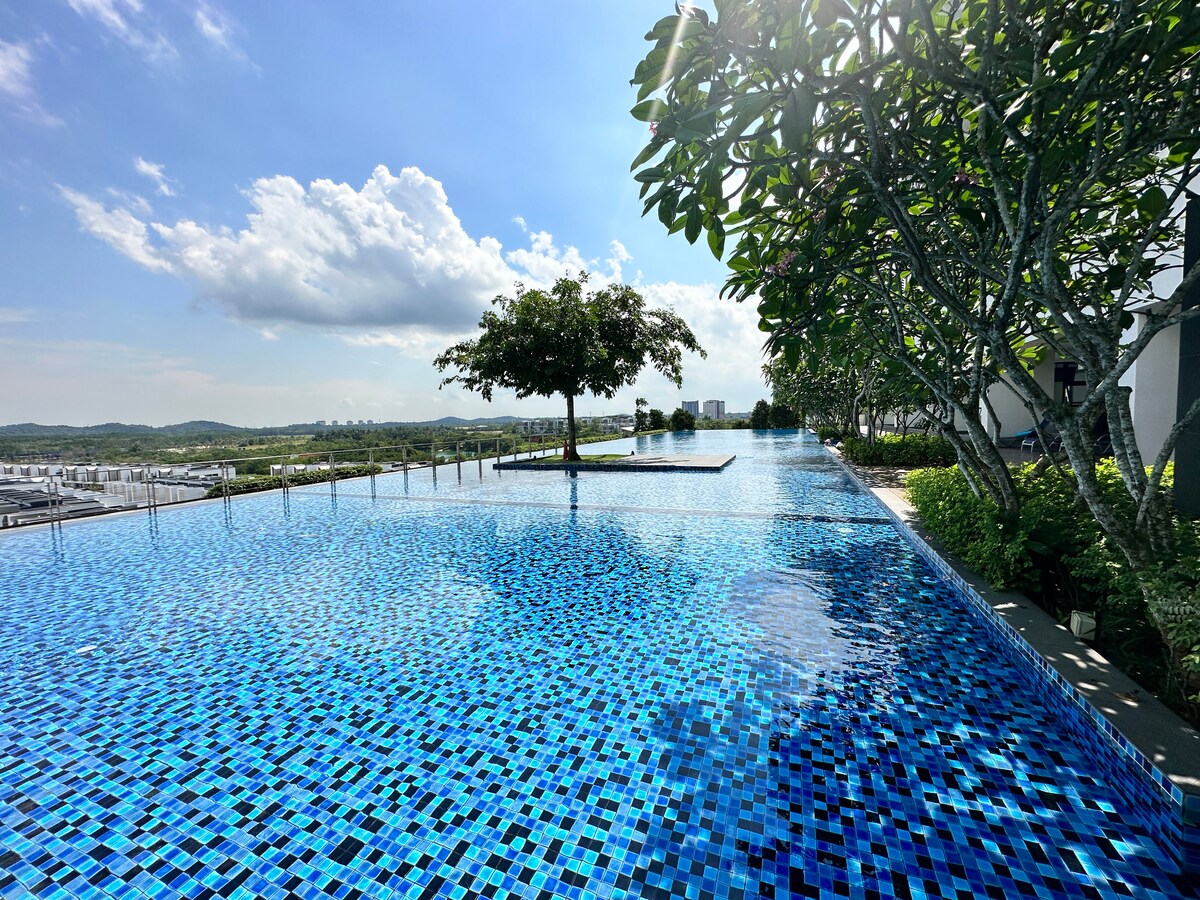 1) Piscines de 1,2 m x 10 pieds x 26 pieds avec 2 toboggans 2) Espace de stationnement pour 5 voitures minimum 3) 7 lits Queen Size, 2 lits simples superposés et 2 lits simples 4) 4 salles de bains privées et 2 salles de bains communes 5) Wifi gratuit 6) 2 unités de distributeur d'eau potable chaude/froide 7) À 5 min en voiture du centre commercial Bukit Indah AEON avec cinéma 8) à 10 min en voiture de Legoland Malaysia ; 9) À 20 min en voiture de Johor Premium Outlet 10) À 25 min en voiture de l'aéroport de Senai.