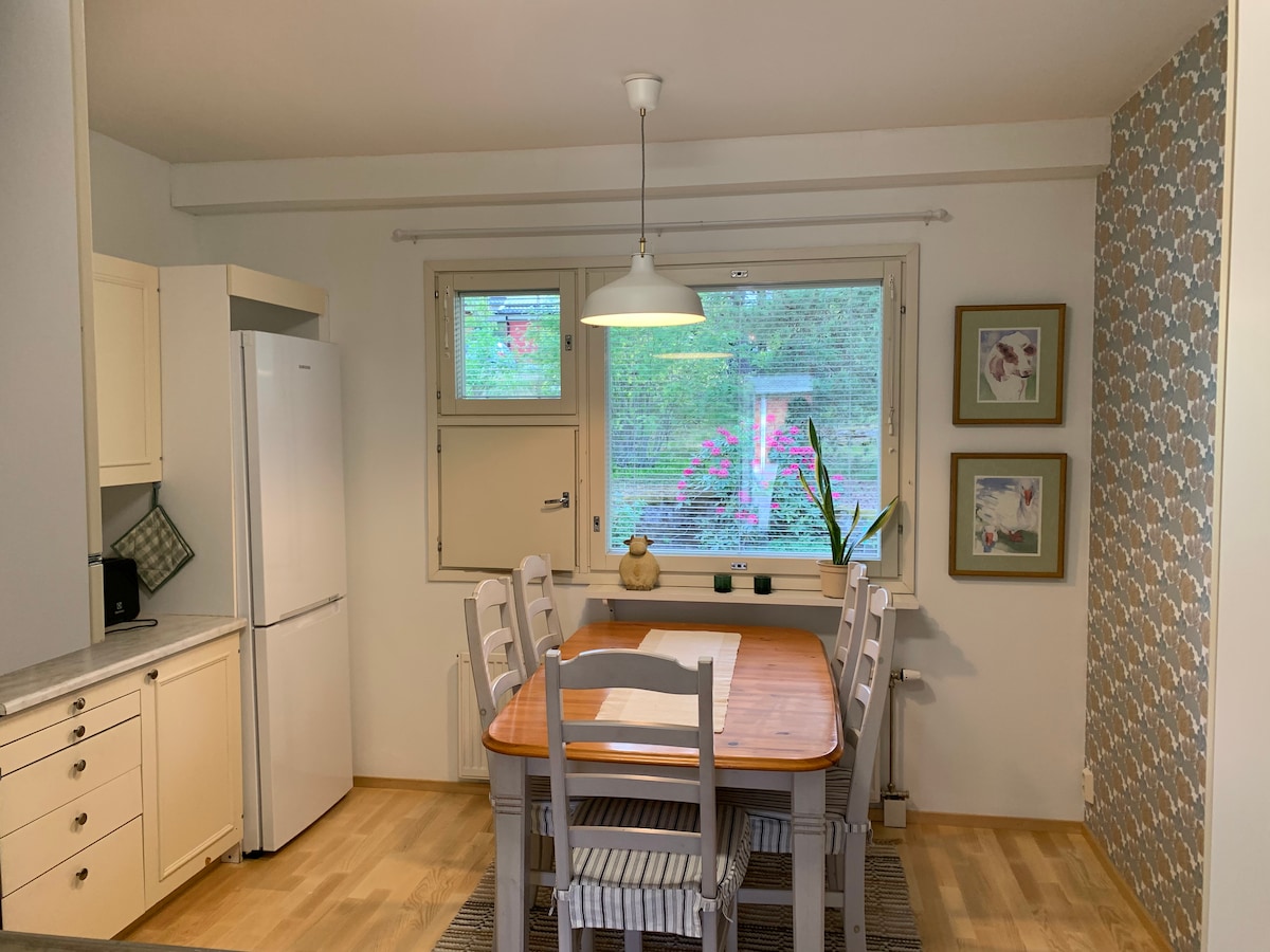 Belle maison de ville dans le centre de Kustavi dans un endroit central mais paisible. Magasin, bureau de poste, restaurant et bibliothèque à moins d'un kilomètre. Une variété d'options de fitness à proximité, telles qu'une piste de morsure, un frisbee golf, un terrain de beachvolley et de tennis, des escaliers de fitness, un parc de sports en plein air et un parc pour chiens. La plage de la municipalité est à 1,5 km. Le vélo dans l'abri peut être utilisé. L'appartement dispose d'une cuisine bien approvisionnée. Les draps, les serviettes et le nettoyage sont compris.