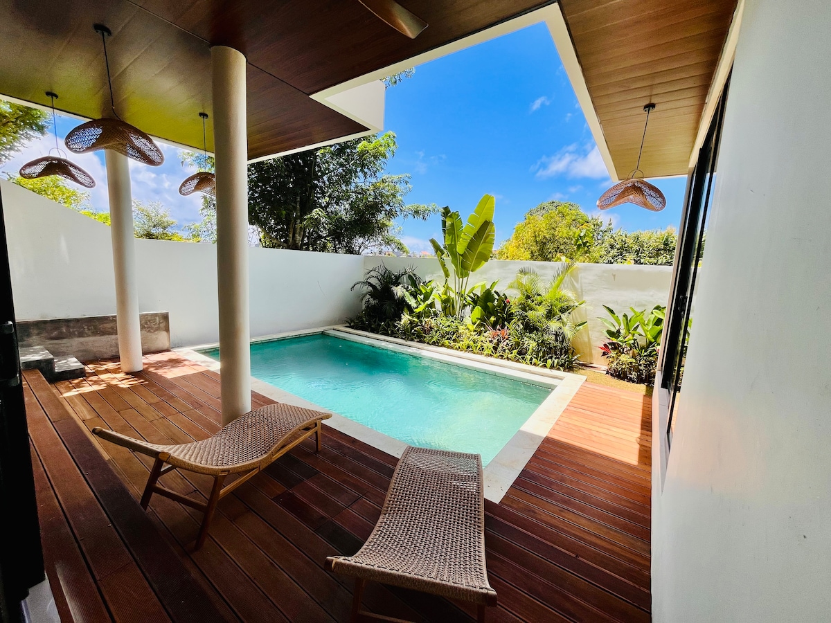 Villa de lune de miel avec immense piscine et jardin de cocotiers. Emplacement privilégié à distance de marche de tous les restaurants et cafés de Canggu. Grande piscine privée et ensoleillée toute la journée, parfaite pour bronzer sur la terrasse. Deux chambres avec lits King Size, climatisation et téléviseurs 55" + salles de bains. Salon avec climatisation, cuisine complète, coin repas et haut-parleur Bluetooth. Le personnel vient tous les jours pour le nettoyage et la table de massage interne - le moyen idéal pour se détendre. Nous sommes entourés des meilleurs cafés et restaurants de Bali, emplacement épique à Echo Beach et Batu Bolong.