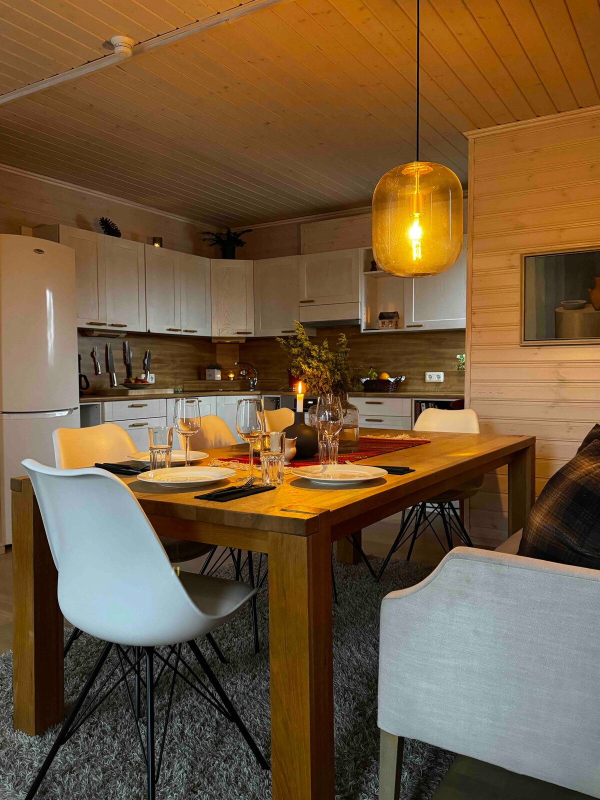 Bienvenue dans notre chalet, situé dans un quartier calme au bord d'un lac. La cabane donne sur le lac, et on peut voir les aurores boréales et le soleil de minuit depuis la fenêtre du salon. La région offre des possibilités variées de randonnée, d'activités de plein air et d'expériences tout au long de l'année. N'hésitez pas à nous demander des conseils :) VEUILLEZ NOTER ! Le lit superposé est partiellement ouvert et ne convient pas aux petits enfants. Les petits enfants peuvent utiliser la chambre, le canapé-lit dans le séjour ou un matelas amovible. Le chalet dispose d'un réservoir d'eau chaude de 120 litres, il y a de l'eau chaude pour 3 à 4 personnes.