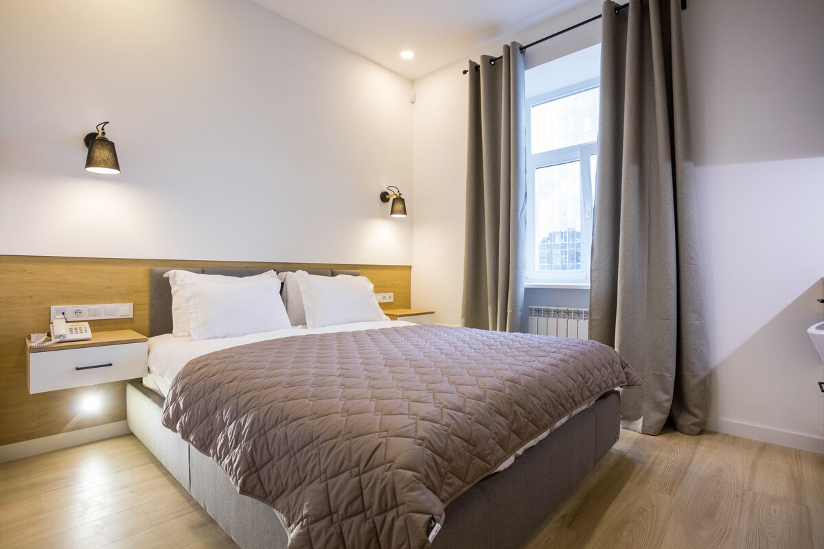 Je vous souhaite la bienvenue dans ce mini-studio de luxe, fraîchement rénové en 2021 dans le centre de Kiev. Le grand lit et le matelas (160x200) sont conçus sur mesure par un fournisseur des grands hôteliers. Les fenêtres de l'appartement ont un triple vitrage donc malgré le fait d'être dans le centre-ville, l'appartement est très calme. La cuisine est entièrement équipée. Le lave-linge est à votre service, ainsi que la fourniture de détergent. Douche propre et moderne fournie avec du shampoing/gel liquide. Arrivée autonome facile et simple après 14 h.