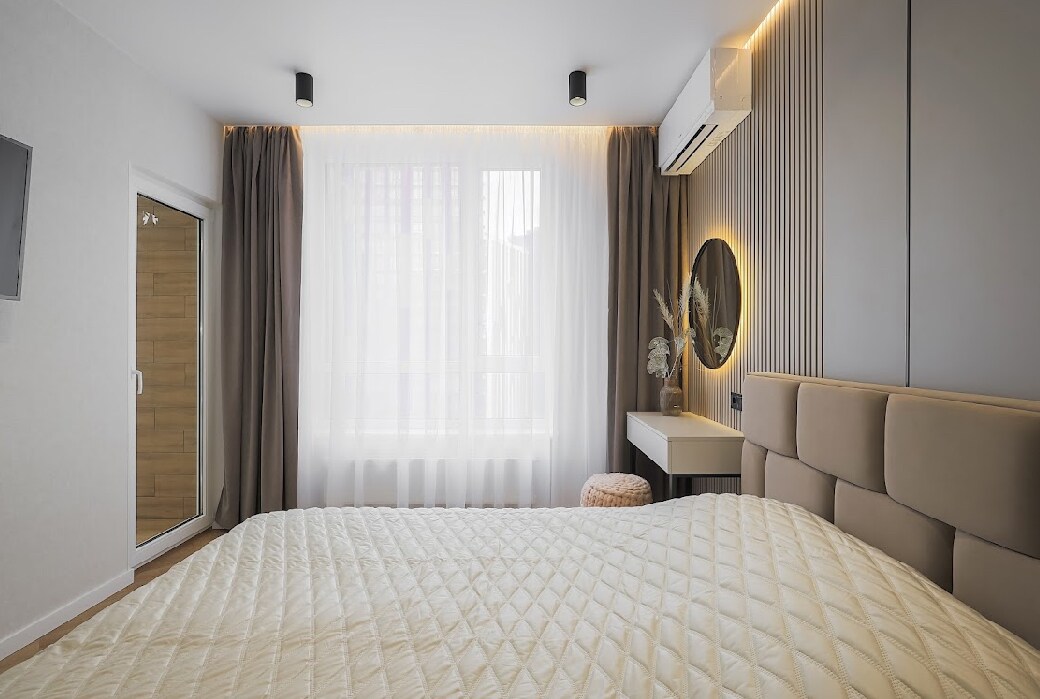 L'intérieur de l'appartement est fait dans un style scandinave léger avec des éléments provençaux. Sur les fenêtres de la cuisine, il y a un décor minimaliste sous la forme de volets roulants confortables, dans la chambre à coucher — des rideaux en matériau léger et fluide, qui sont déplacés sur le côté de la fenêtre elle-même pour laisser entrer autant de lumière du soleil que possible. En face de la maison, il y a un grand supermarché Novus et McDonald's. À 10 minutes, le premier méga centre commercial ukrainien — LavinaMall