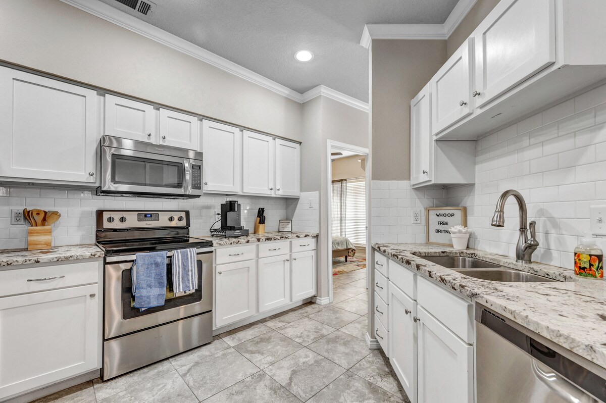 Emplacement central juste à côté de l'autoroute 6, à 11 minutes du campus A&M, à 6 minutes de Blinn. À distance de marche de Starbucks, du restaurant Cracker Barrel, de la salle de sport TruFit Gym, des commerces et plus encore ! Un lit King Size extrêmement confortable dans chacune des deux chambres, une cour arrière privée et clôturée, une connexion Wi-Fi rapide et tout ce dont vous avez besoin pour un séjour longue durée (ou court). Vous aurez : ✔ barbecue, salle à manger ✔extérieure, ✔café✔, thé, télévision ✔65" (films Amazon Prime, Roku, Fire et télévision locale en direct OTA), ✔Wi-Fi, ✔ parking, lits King ✔Size CONFORTABLES