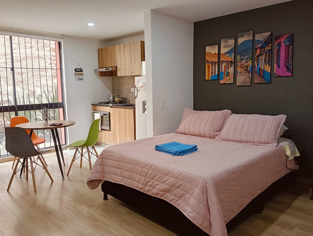 Studio de charme récemment rénové. Cet endroit est stratégiquement situé : à proximité des marchés, des musées, du centre commercial San Martin, de Monserrate, de La Candelaria, de La Plaza del Perseverancia, de la Calle Bonita, du Centre international du parc national (zone financière) et d'innombrables restaurants, bars et activités culturelles qui feront de votre visite de la ville une expérience inoubliable. Le bâtiment dispose d'une salle de sport, d'un espace de coworking, d'une piscine et d'une terrasse avec barbecue au dernier étage avec vue à 360°.