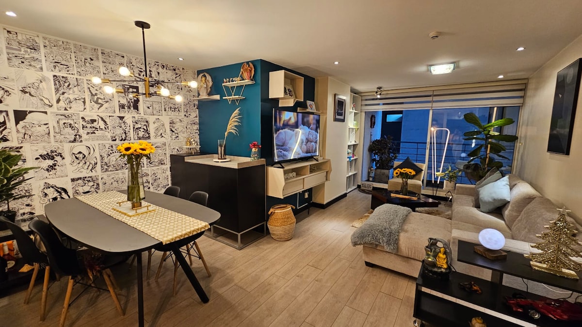 Loft moderne au 21e étage, nouveau bâtiment avec générateur de lumière autonome, idéal pour un voyage d'affaires ou pour une occasion spéciale, vue unique sur la ville. Emplacement privilégié dans le centre nord de Quito à côté du parc La Carolina, et à seulement quelques pas, vous trouverez des centres commerciaux et des institutions financières. Le service comprend un parking, une connexion Wi-Fi, un home cinéma, une baignoire, de l'eau chaude, un lave-linge/sèche-linge commun, des articles d'hygiène, une salle de sport et une piscine.