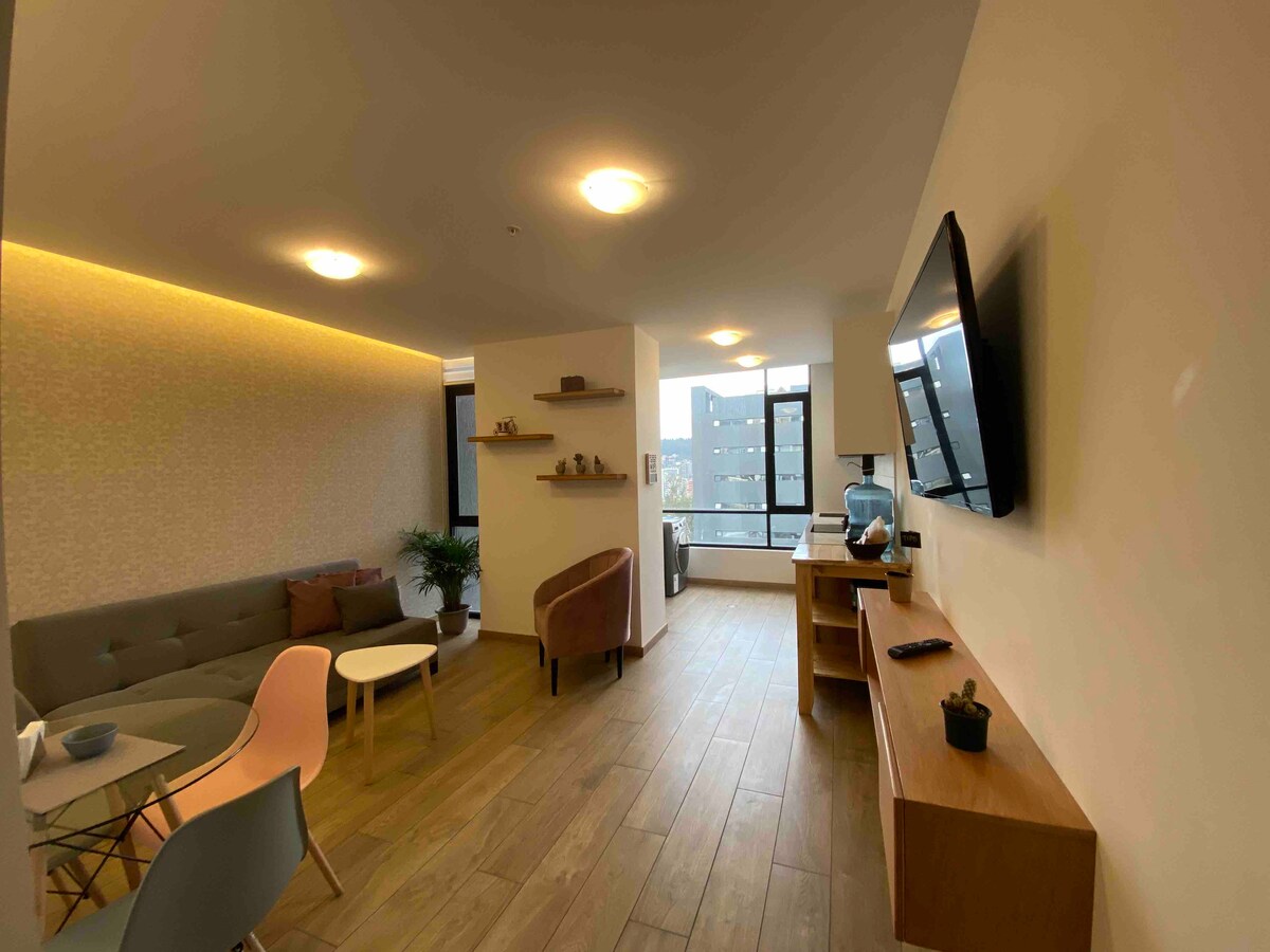 Studio moderne et flambant neuf au 14e étage avec vue directe sur le parc de La Carolina. Équipements du studio : • Wifi haute vitesse par fibre optique • Télévision connectée QLED 55 pouces • Lit ultra-confortable • Cuisine entièrement équipée ; • Salle de bain moderne • Serrure intelligente • Gardiennage 24h/24 Espaces sociaux (17e étage) : • Salle de sport • Espace de coworking avec WiFi • Salle de jeux • Espace barbecue. • Jacuzzi (disponible uniquement pour les séjours de plus de deux nuits) Emplacement privilégié, à seulement 15 minutes du métro de Quito, des centres commerciaux et des restaurants.