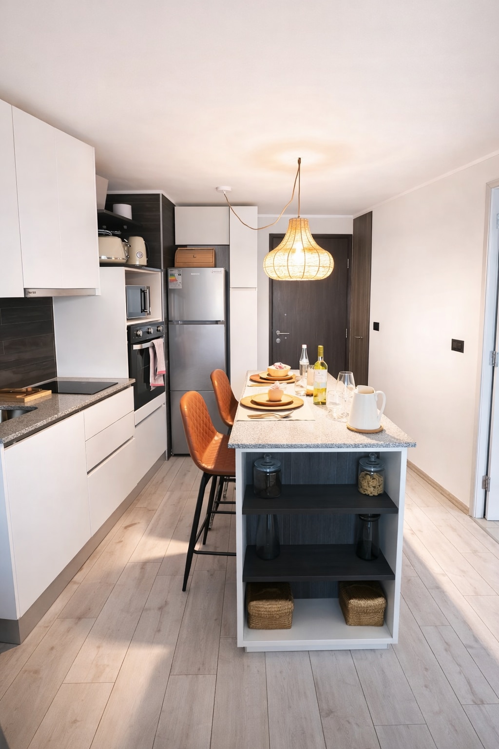 Profitez de cet appartement moderne et confortable. Avec balcon, parfait pour se reposer ou travailler confortablement, avec une cuisine entièrement équipée, le WiFi et un design élégant qui allie chaleur et style. Situé à 4 min du métro Lo Ovalle avec un accès rapide aux autoroutes, cafés, supermarchés, hôpitaux idéal pour les couples, les voyageurs d'affaires ou les courts séjours à Santiago. 🛋️ Living avec canapé confortable 🍳 Cuisine équipée avec four, micro-ondes et bouilloire 🌞 Balcon avec lumière naturelle 💻 Wifi haute