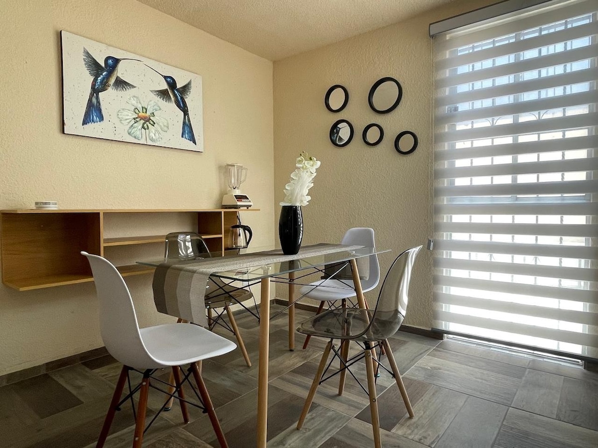 Loft moderne à double hauteur, entièrement équipé. Excellent emplacement pour les voyages d'affaires et d'affaires ; nous avons la facturation et nous offrons des réductions pour les séjours prolongés. Service Internet 600 Mo et TV de TotalPlay. Chambre avec lit queen size à l'étage et séjour avec canapé-lit, 1,5 salle de bain, mini-split de climatisation. Cuisine entièrement équipée, lave-linge, parking privé et espaces verts.