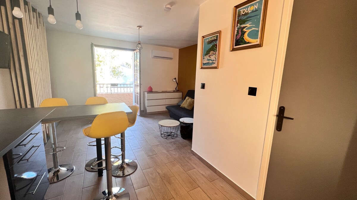 Agréable studio de 25m2 entièrement rénové. Climatisation réversible, lave-linge, TV, box internet, coin bureau, placards, nécessaire de ménage… Terrasse de 7 m2 plein Sud. Bien placé, proche commerces et transports (à quelques mètres seulement de la résidence), places de parking disponibles. A 10 minutes des plages du Pradet. A 15 minutes des plages de Carqueiranne et du Mourillon. La Garde est une ville dynamique avec patinoire, piscine, golf, parc nature et l'Avenue 83.