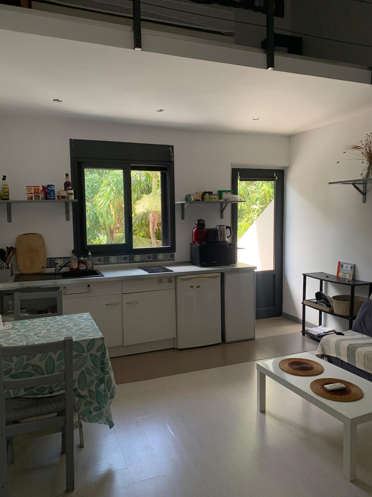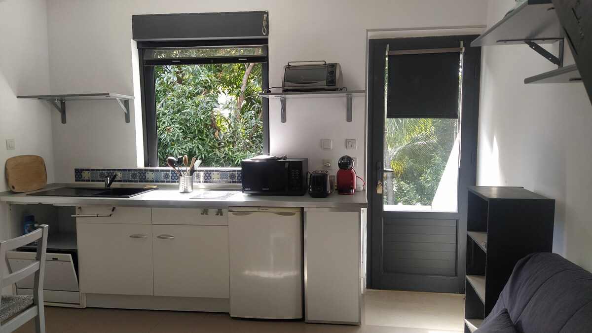 Dépendance chez l'habitant, au coeur de la ville de Saint-Paul et à 300 mètres de la baie de Saint-Paul (plage de sable noir). Nichée dans un jardin calme et abrité par de grands arbres, la dépendance de 40m2 est toute récente et décorée avec des objets et du mobilier ancien de la Réunion. Nos locataires sont souvent des gens qui viennent travailler à distance, faire une pause pro, ou un remplacement/internat à l’hôpital de Cambaie (CHOR).