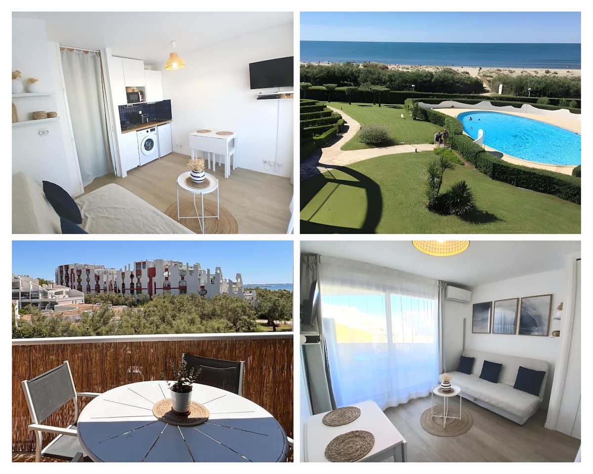 Équipements de base draps et serviettes non inclus (possibilité de location). Les couettes et oreillers sont inclus. L'appartement ne dispose pas du Wi-Fi. 1 place de parking privative Détendez vous dans notre joli studio (20m2) au 2ème étage d'une résidence avec piscine en première ligne de la plage du couchant. piscine ouvert du 15 juin au 15 septembre.