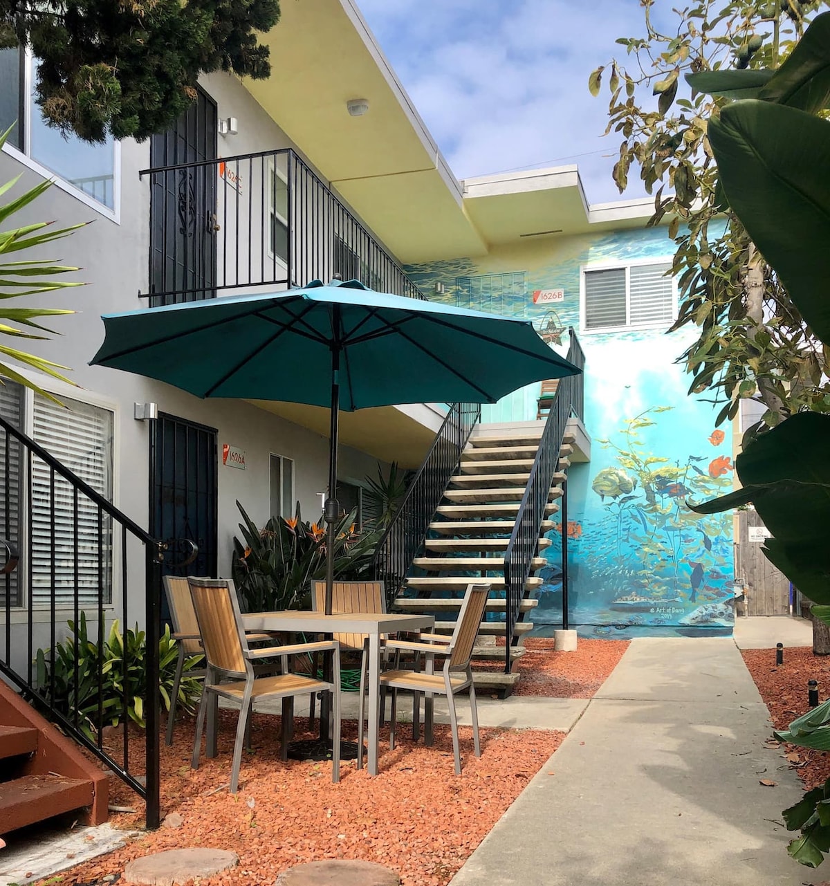 Organisé par Pacific Beach Luxury, visitez en ligne pour voir des visites virtuelles/vidéos/réductions. Idéalement situé à un pâté de maisons de la plage et à deux pas des restaurants, des boutiques, de Brandy Melville, de Beginning Boutique et des locations de vélos et de planches de surf ! Cet appartement de 2 chambres et 2 salles de bain à l'étage a été entièrement rénové et magnifiquement décoré, équipé de la climatisation, d'une télévision et d'un parking. La cour avant fermée avec barbecue et aire de jeux et le patio arrière avec barbecue sont partagés entre 4 logements. Équipement de plage/bébé fourni. La vitesse d'Internet est de 500 Mbit/s.