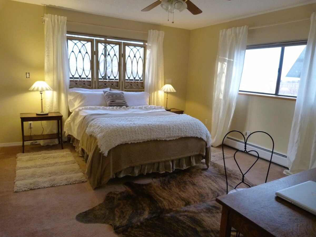Studio charmant, unique et privé avec lit King Size, futon Queen Size, kitchenette, salle de bain et coin repas sur un magnifique ranch privé à quelques minutes du centre-ville de Durango, des sources chaudes de Durango et de la station de ski de Purgatory. Ambiance chaleureuse et accueillante et cadre naturel avec une belle vue, des étangs et Cooncreek qui les traverse. Possibilité de pension pour chevaux la nuit moyennant des frais supplémentaires. Nous sommes ouverts aux enfants. S'il vous plaît ! Pas d'animaux de compagnie !! Les animaux d'assistance ne doivent pas être laissés sans surveillance !!!