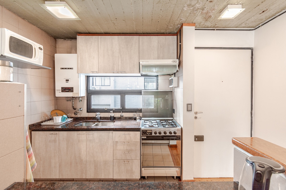 Il vaut la peine de monter 4 volées d'escaliers en marbre pour atteindre ce refuge lumineux et aéré. Passez une soirée sur une terrasse en damier avec un barbecue à une extrémité et un jacuzzi romantique à l'autre. Choisissez un livre à lire plus tard ou dirigez-vous directement vers le lit confortable de 2 x 2 m. À 2 minutes à pied de la ligne de métro qui relie le centre de la ville. Recoleta et Palermo sont accessibles à pied. Il n'y a pas d'ascenseur pour monter au loft. L'utilisation du jacuzzi en hiver n'est pas recommandée. Il n'a pas son propre chauffage, bien qu'il puisse être rempli d'eau chaude, il se refroidit très rapidement pendant l'hiver.