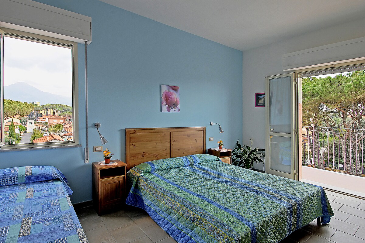 Appartements à 300 mètres de la plage de Marina di Massa, climatisés dans un hôtel, avec chambre double et chambre avec 1 lit, salon, kitchenette, salle de bain et place de parking réservée. Bar-restaurant à l’intérieur de l’établissement. Logement adapté également à ceux qui travaillent. Taxe de séjour 1.50 personne en été. Air conditioned apartments in Marina di Massa 300 meters from the beach. City tax euro 1.50 during summer season