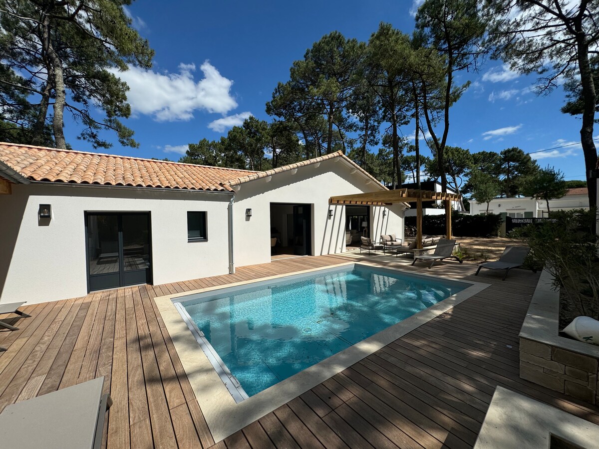 Luxueuse Villa de plain pied baignée de lumière sous les pins à 150 m de la plage avec piscine 4x6 chauffée de mai à septembre et sécurisée par un volet roulant. Située dans une impasse avec son parc arboré de 900 m2, fermé par un portail automatique , ses équipements sont de haute qualité. Vous pourrez prendre tous vos repas sur les terrasses en bois en toute tranquillité ou bien y faire la sieste en regardant les écureuils sautés d'arbre en arbre. Meublé de tourisme 4 étoiles