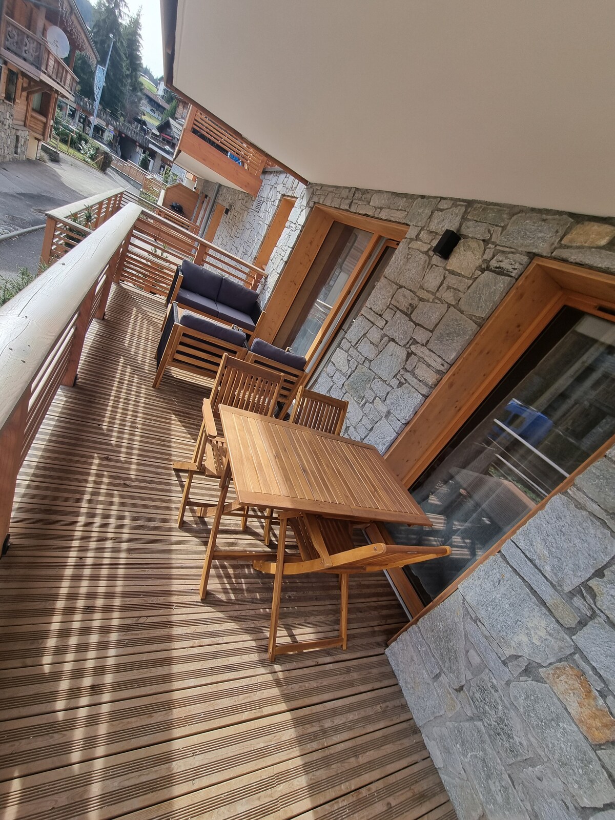Family chalet. Quiet position in cul de sac. Fabulous mountain views. Sleeps MAX eight in four bedrooms. One ensuite, three further bathrooms. Bedroom four - choice of two single beds in sous sol or bunk room off living area, suitable for younger children. Perfect in winter and summer . Ski in/out. Short walk across to the village. Five minute walk to the lake, close to the bike park. Spacious, open plan living, kitchen, dining with stunning views across the village to Mont Chery.