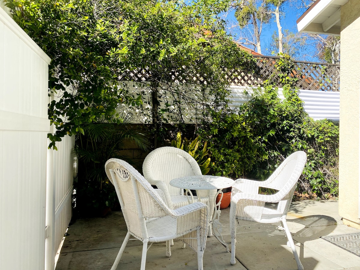 À seulement 3 minutes de l'autoroute 5 se trouve ce studio attenant mais privé. Une fois passée votre entrée privée, vous vous sentirez comme chez vous. Lit queen size confortable, cheminée et kitchenette entièrement approvisionnée avec mini-réfrigérateur/congélateur si vous avez envie de cuisiner. Il y a également une table/bureau pour 2 personnes devant le foyer électrique chaud. Le ventilateur de plafond garde les choses au frais. Salle de bain complète avec douche et baignoire. La plage de Salt Creek, le port de Dana Point et Trestles sont à seulement 15-20 minutes. Excellent emplacement !